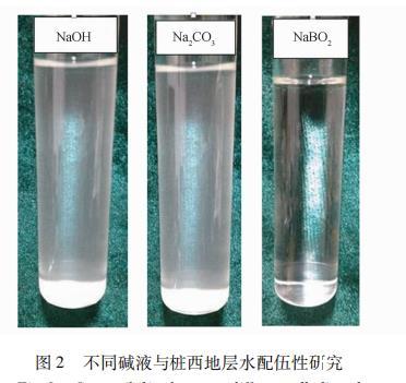 由上述研究结果可以看出,单一的表面活性剂不能使油水界面张力达到超低,因此可考虑加入碱,利用碱的协同效应,降低油水界面张力。桩西原油的酸值较高达到1.65 mg(KOH)/g,且地层水中Ca2+、Mg2+离子含量较高。应用常规碱,如氢氧化钠、碳酸钠,会产生结垢问题。偏硼酸钠是一种弱碱,可以螯合Ca2+、Mg2+,与地层水混合不会生成沉淀,配伍性较好(0.1%不同碱与地层水配伍性情况见图2)。