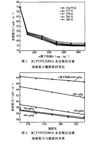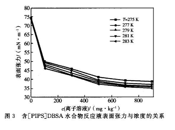 随着温度的升高,表面张力有所降低。在275~283K,温度对表面张力影响不大。从图1、图2可知:溶液浓度是影响含[MIMPS]DBSA水合物反应液表面张力的主导因素。因超过700mg/kg后,水合物反应液表面张力降低效果很小。综合考虑用量和效果,以c=700mg/kg为最佳浓度。