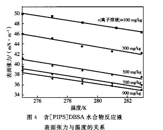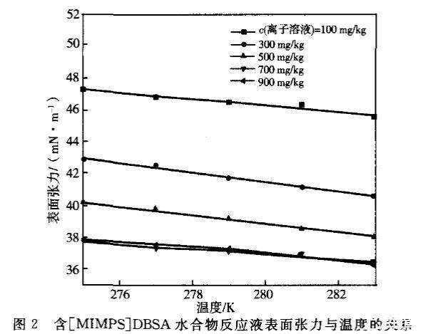 图2为含[MIMPS]DBSA水合物反应液表面张力与温度的关系。