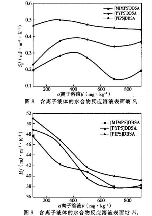 表1是不同浓度的离子液体表面熵S_i、表面焓H_r的值。