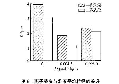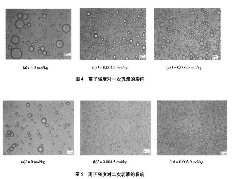 用电子显微镜观察不同离子强度下的乳液情况。图4为离子强度对一次乳液的影响,图5为离子强度对二次乳液的影响。由图4、图5可知,在离子强度为0的条件下界面张力大,所以制得的乳液粒径也较大且大小不均一。离子强度为0.0045 mol/kg时,界面张力最小,所以乳化效果较好,制得的乳液液滴粒径最小,大小也比较均一。离子强度为0.0060 mol/kg时,随离子强度的增大,界面张力先降低后又回升,所以乳液液滴也增大,而且大小没有离子强度为0.0045 mol/kg时制备的乳液均一。随离子浓度的变化,一次乳液和二次乳液粒径的变化是相同的,如图6所示。