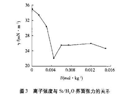 由图3看出,离子强度与St/H₂O界面张力的关系也存在一个拐点。这是因为随着盐度增大水相中大量存在的Na⁺促使Naw⁺ + Aw⁻ → (NaA)w → (NaA)o(式中:w代表水相;o代表油相),平衡向右移动,大大减少了界面层中的活性物A⁻,而导致界面张力先下降后回升的现象。根据界面张力最低值为最佳浓度原则,实验选择Na2SO4质量摩尔浓度为0.0045 mol/kg。从图3还可以看出,St/盐溶液界面张力比图1中St/SDS水溶液界面张力和图2中St/PVA水溶液界面张力都大。这是因为Na2SO4在水中只能单纯地提供Na⁺和SO4²⁻,而SDS作为一种阴离子表面活性剂,分子的一端提供了亲水基,PVA由于其羟基作用,也起到了助乳化作用,故界面张力较小。
