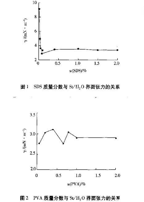 由图1可以看出,随着SDS浓度的增加,苯乙烯与SDS水溶液的界面张力先迅速下降,再略有上升,后基本保持平衡。当活性剂在溶液中的浓度达到一定值以后,如果其浓度进一步增加,整个体系的能量达到最低,此时活性剂分子中的长链亲油基缔合在一起,形成胶束,而胶束的存在破坏了油水界面的混合界面膜,因此溶液界面张力又略有回升。SDS的临界胶束质量分数为0.086%。由图1也可以得知,对于本实验体系SDS的最佳质量分数为0.065%。由图2可以看出,PVA浓度对界面张力的影响不大,作为稳定剂,起到一定助乳化剂的功能。